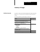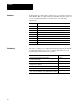 Appendix D Specifications Specification Function • • • • • • Location • 1775 S5 - single slot in a PLC 3 chassis • 1775 SR5 - single slot in a PLC 3/10 chassis I/O Capacity per Scanner • 2,048 I/O (any mix) • 4,096 I/O (complementary) Communication Rates (in kbps) • 57.6 at 10,000 cable ft. (DH, DH+, I/O) • 115.2 at 5,000 cable ft. (I/O only) • 230.4 at 2,000 cable ft. (I/O only) Cabling • Twinaxial Cable (cat. no.