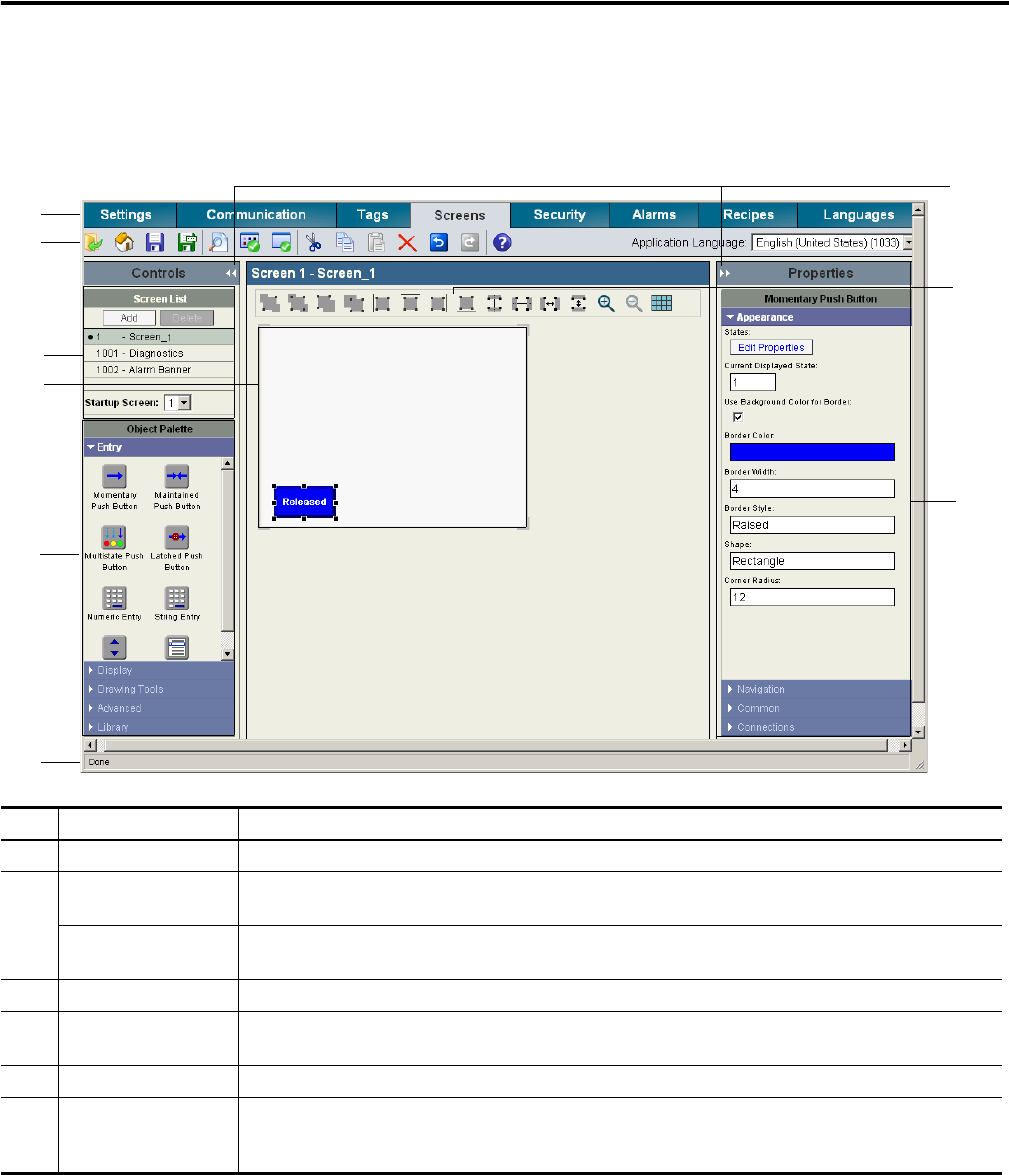 4 Screen list Contains a list of screens in the application including the alarm banner and diagnostics banner.