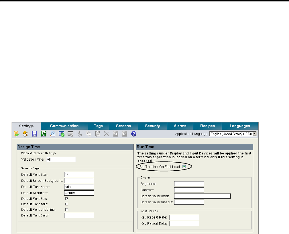 When the Set Terminal On First Load checkbox is checked, the first time the application is loaded to the
