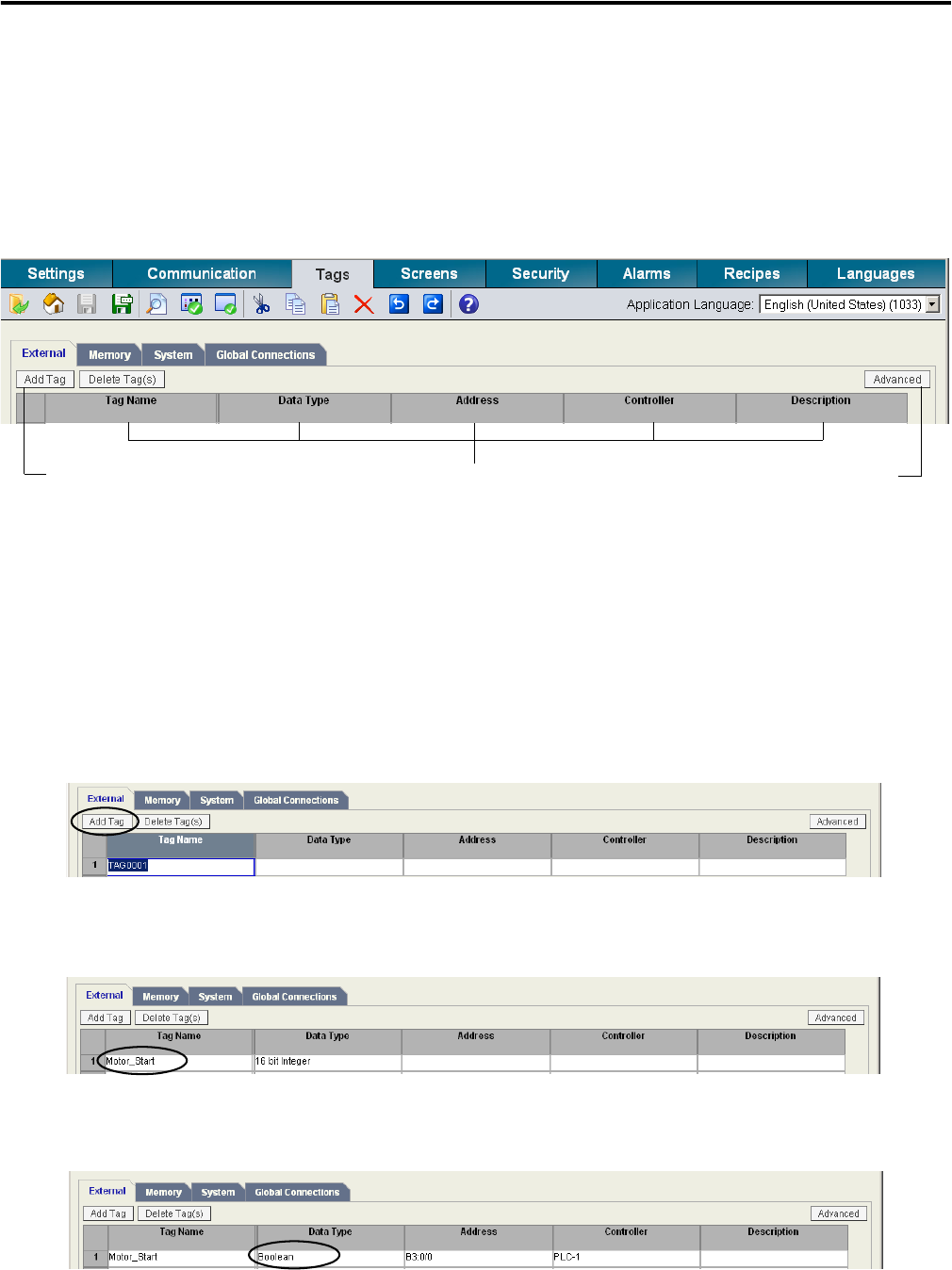 Each tag occupies a separate row in the Tags view. The fields in each row define the attributes of a tag. Tags