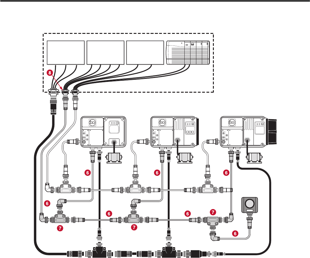➐ Control Power Tees - The E-stop In Tee (Part Number: 898N-653ES-NKF) is used to connect to the Bulletin 800F On-Machine E-Stop station using a