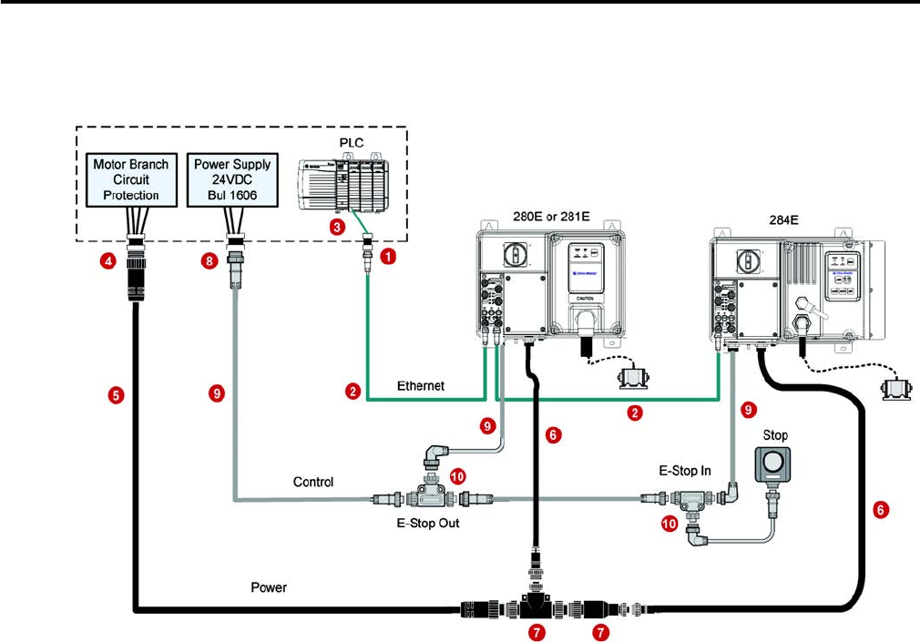 Machine E-Stop station using a control power media patchcord. The E-stop Out tee (Cat. No. 898N-653ES-