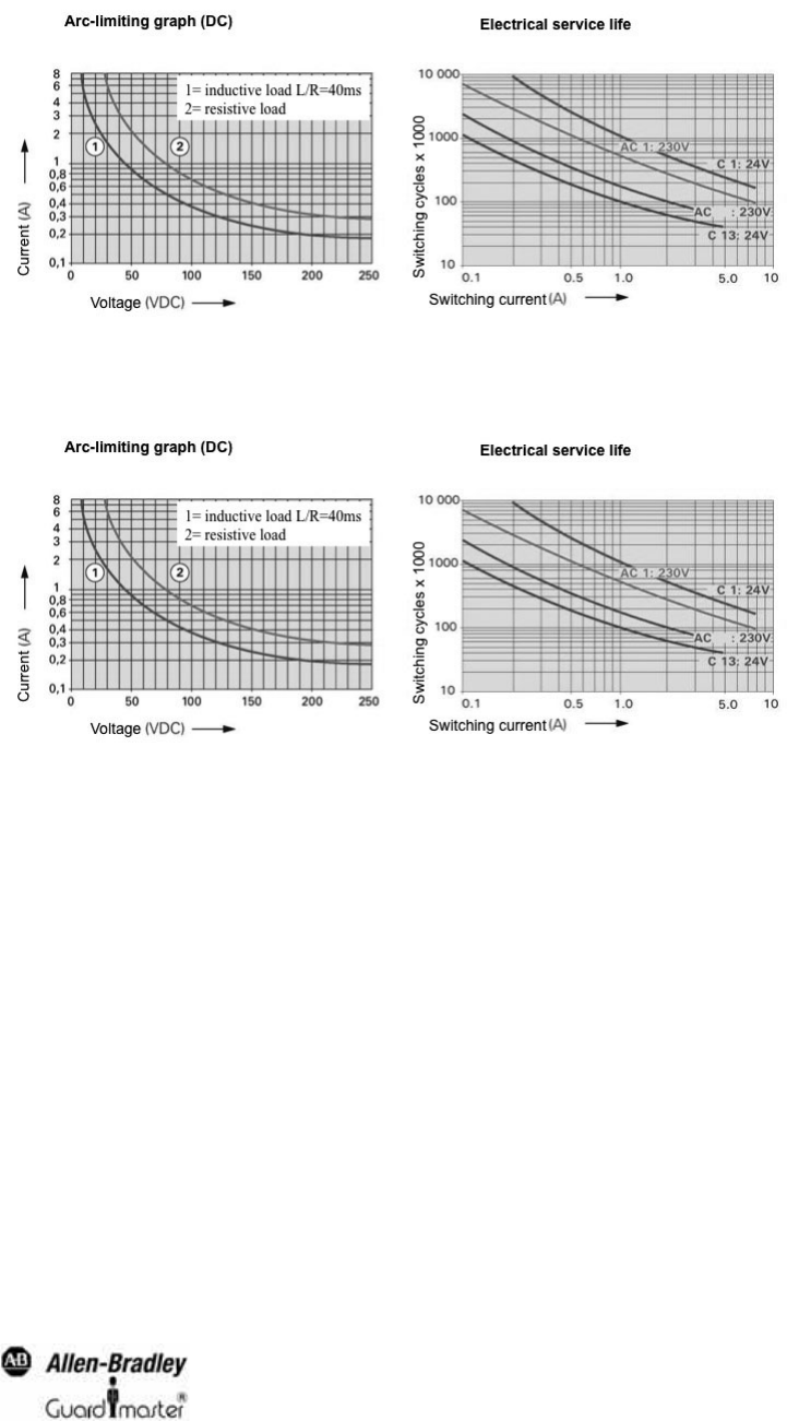 Figure 7: Arc-limiting graph and lifespan curve for MSR45E expansion modules (secure off switching, no standing arc, max. 1 operating cycle / s)