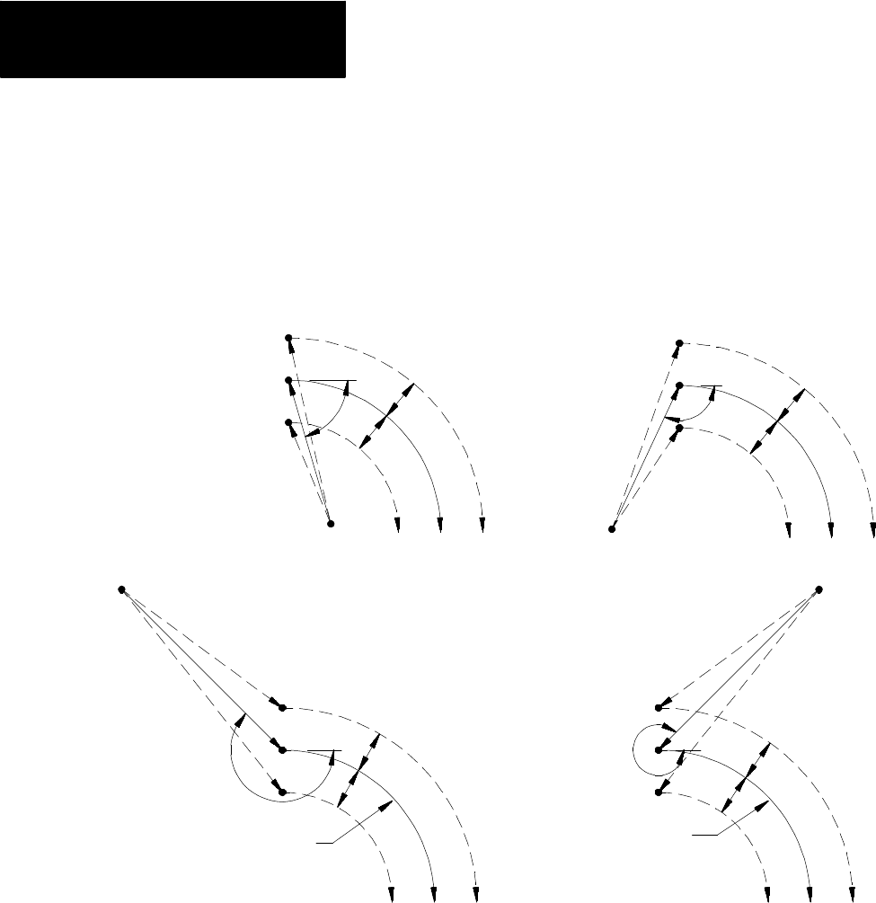 angles to a tangent line drawn from the start-point of that circular move.