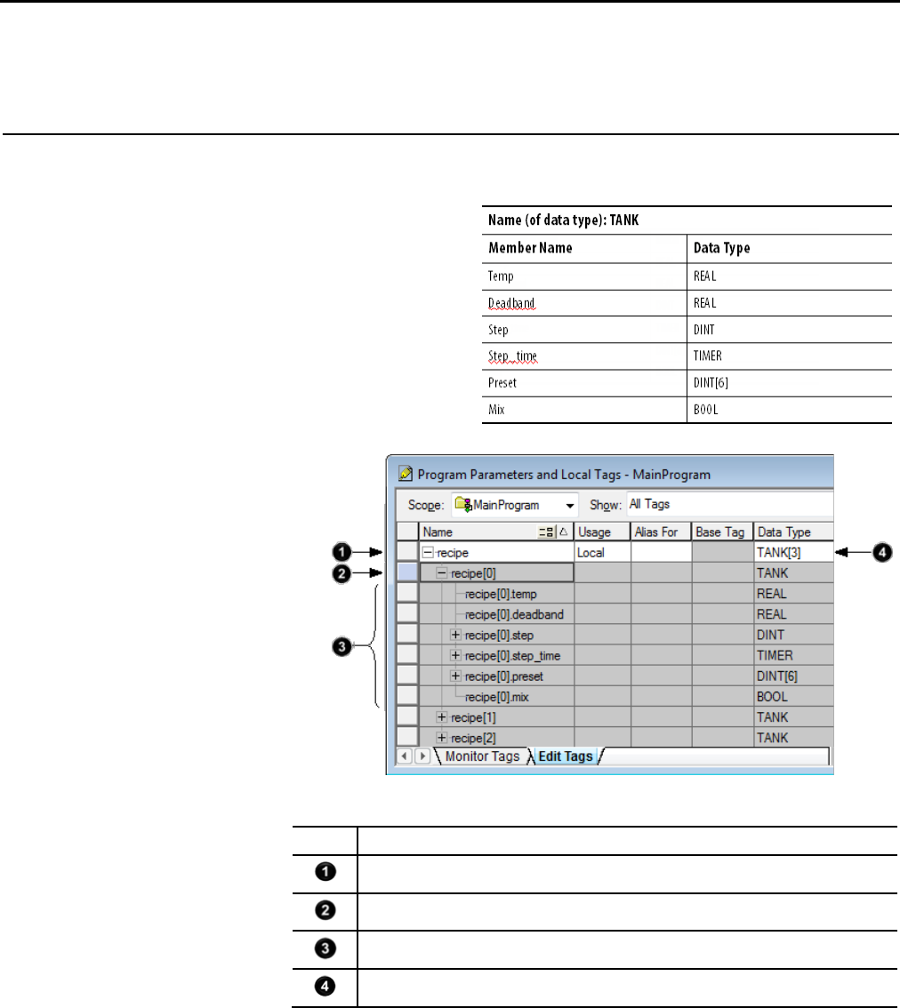 In a system of several tanks, each tank can run a variety of recipes. Because the recipe requires a mix of data types (REAL, DINT, BOOL, so forth), a user-defined data