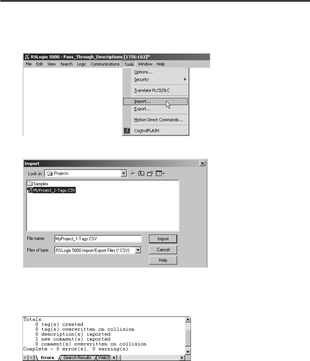 1. In RSLogix 5000 software, from the Tools menu, choose Import.