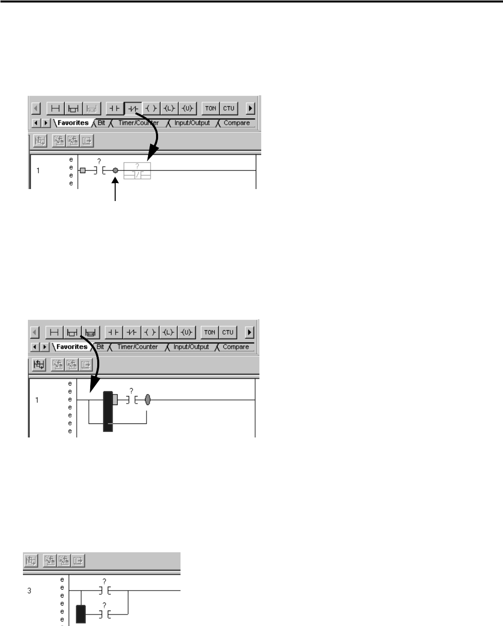 Drag the button for the rung or instruction directly to the desired location. A green dot shows a valid
