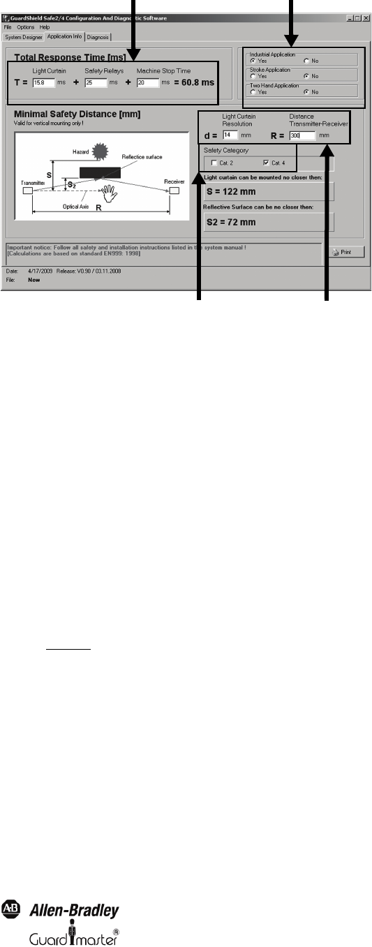 Once all the data has been entered the window will display the minimal light curtain mounting distance and the minimal reflective surface distance data