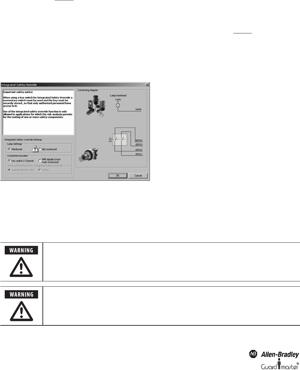 application a key switch must still be placed in series with the two safety signals. Only when the key switch is activated and the safety signals are