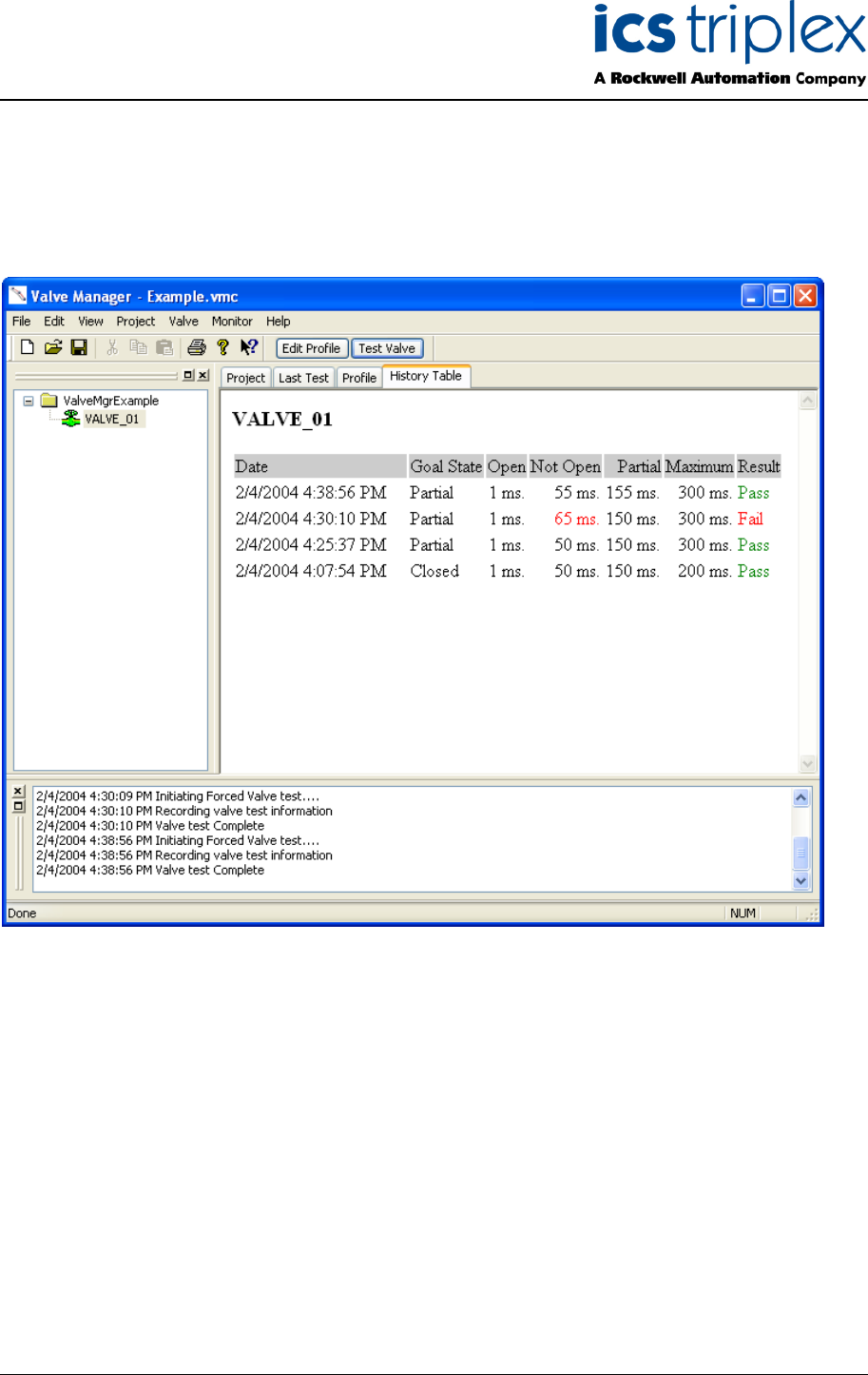 The History Table view displays information about all of the recorded tests for the selected valve in a