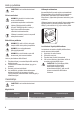 • • • Rengör produkten med en fuktig, mjuk trasa. Använd bara neutrala rengöringsmedel. Använd inte produkter med slipeffekt, skursvampar, lösningsmedel eller metallföremål. Förvara inte explosiva ämnen som t.ex. sprejburkar med lättantändligt bränsle i den här produkten. Om nätsladden är skadad måste den bytas av tillverkaren, tillverkarens auktoriserade servicerepresentant eller personer med motsvarande utbildning, för att undvika fara.