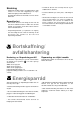 Skrotning • Kontrollera att barn eller små djur inte tar sig in i tvättmaskinens trumma. • Hjälp till att undvika skador, när tvättmaskinen skall skrotas. Lossa den från vägguttaget och kapa kabeln vid utgången från tvättmaskinen. Kontakta din kommun för information om var du kan lämna den. • Förvara tvättmedel på säker plats; oåtkomligt för barn. • När maskinen är uttjänt och ska forslas bort, ska du dra ut stickkontakten och skära av nätkabeln. Stickkontakten och resterna av nätkabeln ska kastas.