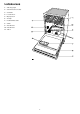 Laitekuvaus 1. Yläkorin pysäytin 2. Vedenkovuusalueen säätö 3. Suolasäiliö 4. Pesuainelokero 5. Ohjauspaneeli 6. Arvokilpi 7. Huuhtelukirkastesäiliö 8. Siivilät 9. Alasuihkuvarsi 10. Yläsuihkuvarsi 11.