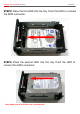 External enclosure Installation [ R2-JBOD ] User Manual STEP2: Place the first HDD into the tray. Push the HDD to connect the SATA connector. STEP3: Place the second HDD into the tray. Push the HDD to connect the SATA connector. Note: Make sure all connectors are connected well.
