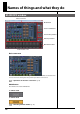 Names of things and what they do M-400 RCS window fig.ScrRCSGuide.eps Basic screen area Mode button Screen recall buttons Scene memory buttons Fader layer buttons Main fader module Fader modules 1–24 Basic screen area fig.ScrChDisp.eps This shows a screen of the same design as the screen of the M-400 console itself. You can use the mouse and keyboard to perform operations in this screen. "Operations in the main screen area" (p. 14) Mode button This switches the mode of M-400 RCS.