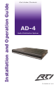 AD-4 Audio Distribution System It’s Under Control® Remote Technologies Incorporated 5775 12th Avenue East, Suite 180 Shakopee, MN 55379 Tel: 952-253-3100 Fax: 952-253-3131 www.rticorp.com © 2010 Remote Technologies Inc. All rights reserved. Printed in Taiwan.