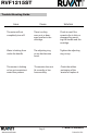 ® RVF1215ST Trouble-Shooting Guide Issue Cause The water will not completely turn off. There is a dirty, worn out, or damaged washer in the cartridge. Check to see if the ceramic disc is dirty or damaged by removing the handle and the cartridge. Water is leaking from under the handle. The adjusting ring or cap has become loose. Tighten the adjusting ring or cap. The aerator is leaking or has an inconsistent water flow pattern. The aerator does not fit correctly or has become dirty.
