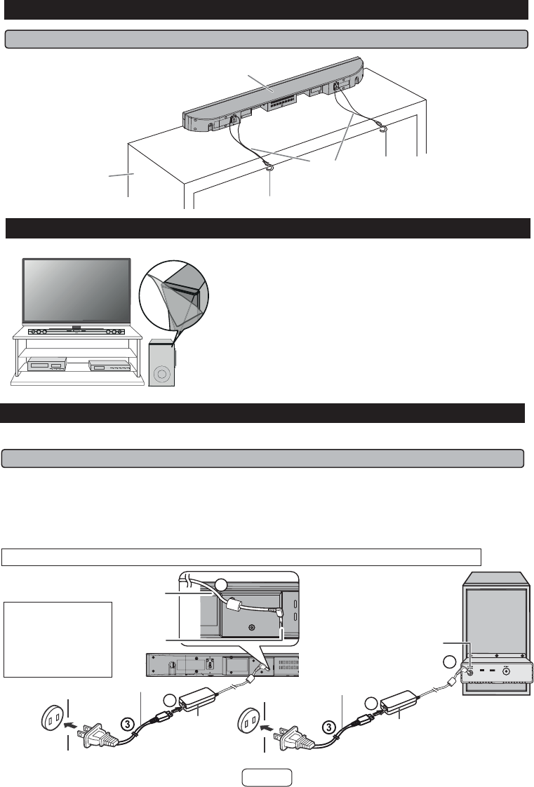 2 Plug the AC/DC adaptor cable into the DC INPUT jack on the sound bar and subwoofer.