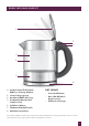 KNOW YOUR SAGE® PRODUCT A E F B C D G A. Cushion Controlled Lid with BPA Free* Viewing Window B. 1 Litre/4 Cup Capacity C. German SCHOTT Glass Jug D. Premium Quality Brushed Stainless Steel E. Lid Release Button F. Illuminated On/Off Switch G. Multi Directional Base NOT SHOWN • • • Concealed Element Auto Shut Off & Boil Dry Protection Hidden Cord Storage *Sage.