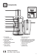 Components D A J B C D I E F G H A. Food pusher (not dishwasher safe) B. Interlocking safety arm C. Juicer cover (dishwasher safe) D. Stainless steel filter basket (dishwasher safe) E. Pulp container (dishwasher safe) F. Filter bowl surround (dishwasher safe) G. Variable speed control and off dial H. Overload protection indicator light I. 2 litre juice jug and sealing lid with built in froth separator (dishwasher safe) J.