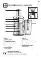 PL Opis Twojego nowego urządzenia D A J B C D I E F G H A. Popychacz (nie można myć w zmywarce) B. Ramię z litego metalu z blokadą zabezpieczającą C. Pokrywa sokowirówki (można myć w zmywarce) D. Nierdzewne sitko (można myć w zmywarce) E. Pojemnik na miąższ (można myć w zmywarce) F. Uchwyt sitka (można myć w zmywarce) G. Elektroniczny regulator prędkości H. Kontrolka ochrony przed przeciążeniem I. 2 l pojemnik na sok z pokrywą (można myć w zmywarce) J.
