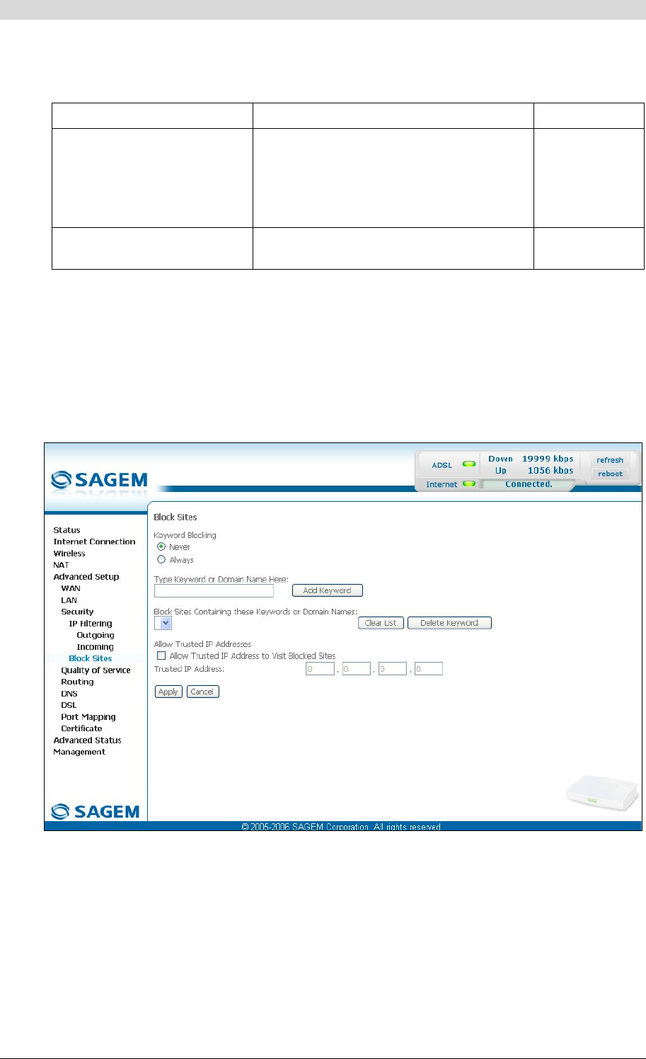 • Select the Block Sites sub-menu in the Security menu in the Advanced Setup section to