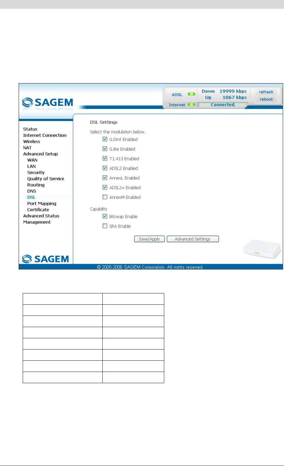 • Select the DSL menu in the Advanced Setup section to display the following screen: