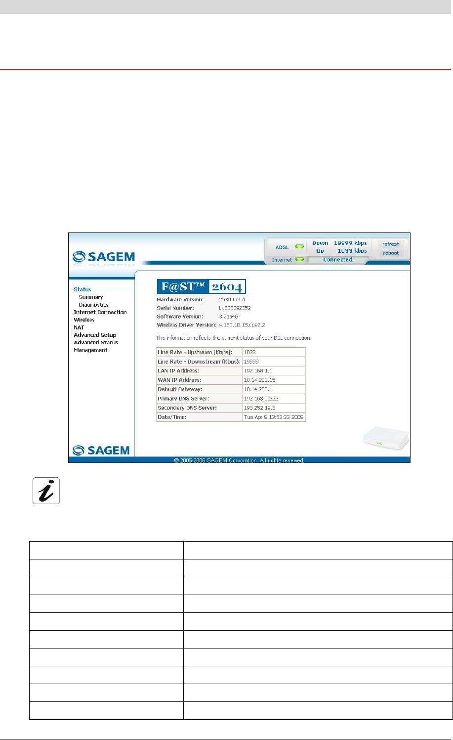 • Select the Summary menu in the Status section; the following screen opens:
