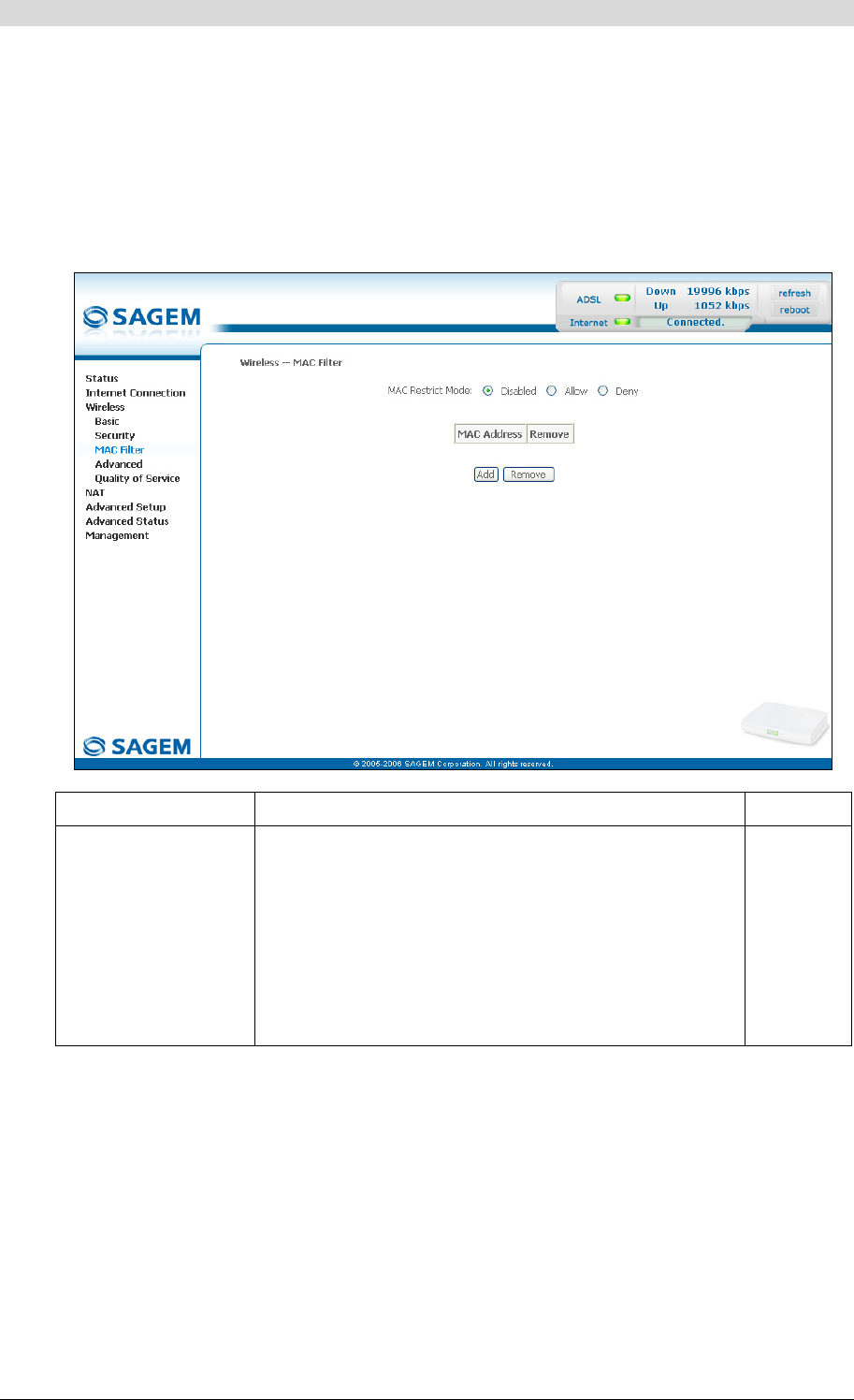 • Select the MAC Filter menu in the Wireless section to display the following screen: