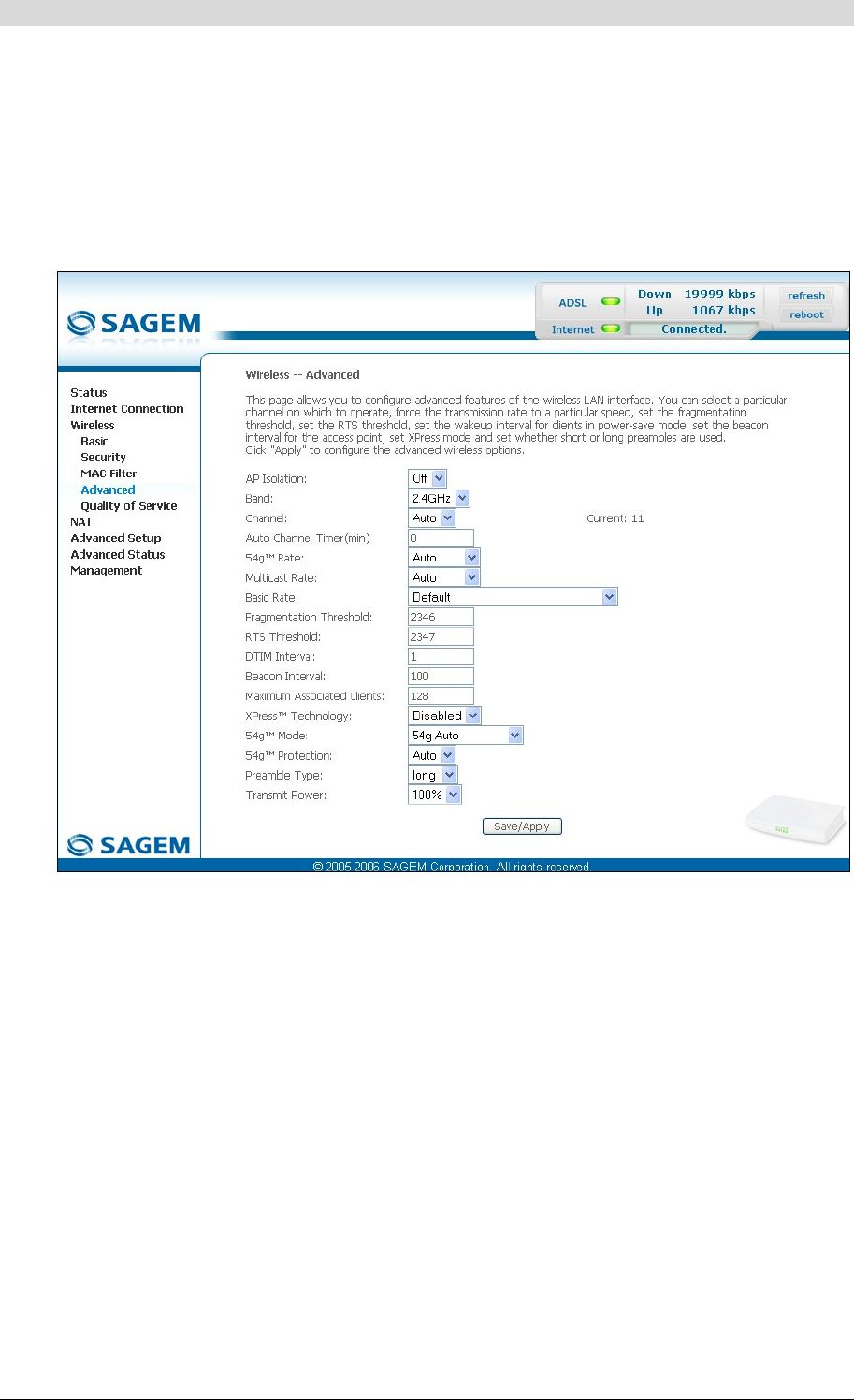 • Select the Advanced menu in the Wireless section to display the following screen: