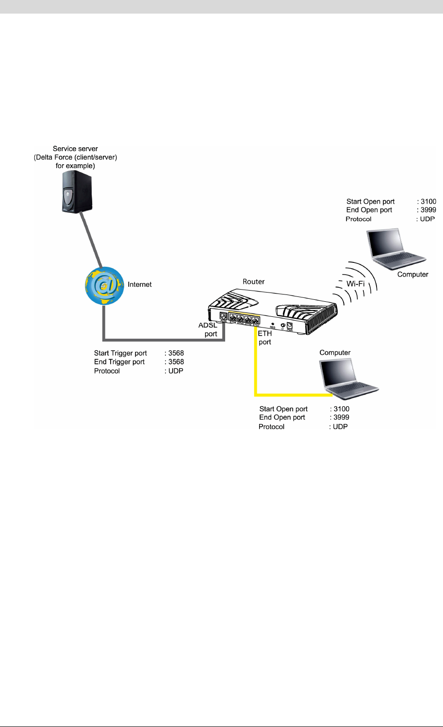 Using the "Trigger" 3568 port (WAN side), the "Delta Force" service server triggers the opening