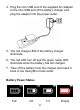 - 4. Plug the mini USB end of the supplied AC adaptor to the mini USB port of the battery charger and plug the adaptor into the power outlet. 5. The red charge LED of the battery charger illuminate. 6. The red LED turn off and the green ready LED illuminate when the battery has full charged. 7. Take off the battery from the charger and insert it back to the SwingShot Camcorder.