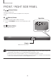 DESCRIPTIONS DESCRIPTIONS FRONT / RIGHT SIDE PANEL 1 / (Volume) Button Controls the volume level. The numeric value of the volume level appears in the front panel display. 2 (Source) Button Right Side Selects the D.IN, AUX, HDMI1, HDMI2, or BT input. ●● To turn on BT PAIRING mode, press and hold this button in BT mode. 3 (Power) Button 1 2 3 Turns the power on and off. Display Displays the current mode. ●● When you plug in the AC cord, the power button will begin working in 4 to 6 seconds.