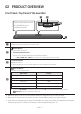 02 PRODUCT OVERVIEW Front Panel / Top Panel of the Soundbar Position the product so that the SAMSUNG logo is located on the top. Top Panel Display Displays the product’s status and current mode. (Power) Button Turns the power on and off. •• Auto Power Down Function The unit turns off automatically in the following situations: –– In D.IN / HDMI / BT / USB Mode : If there is no audio signal for 20 minutes. -/+ (Volume) Button Adjusts the volume.