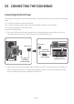 03 CONNECTING THE SOUNDBAR Connecting Electrical Power Use the power components to connect the Subwoofer and Soundbar to an electrical outlet in the following order: 1. Connect the power cord to the Subwoofer. 2. Connect the power output cable to the power adapter, and then to the Soundbar. 3. Connect the power cord to a wall socket. See the illustrations below. •• For more information about the required electrical power and power consumption, refer to the label attached to the product.