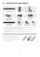 01 CHECKING THE COMPONENTS PAIR SOUND MODE VOL WOOFER SOUNDBAR Soundbar Main Unit Subwoofer Remote Control (AH81-09784A) / Batteries AC/DC Adapter (Soundbar) (AH81-09783A) HDMI Cable (AH81-11233A) x2 Power Cord (Subwoofer, Soundbar) (AH81-09826A) x2 Wall Mount Guide (AH81-09822A) Holder-Screw (AH81-09824A) x2 Bracket-Wall Mount (AH81-09823A) x2 Screw (AH81-09825A) •• For more information about the power supply and power consumption, refer to the label attached to the product.