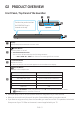 02 PRODUCT OVERVIEW Front Panel / Top Panel of the Soundbar Position the product so that the SAMSUNG logo is located on the top. Top Panel Display Displays the product’s status and current mode. (Power) Button Turns the power on and off. •• Auto Power Down Function The unit turns off automatically in the following situations: –– In D.IN / HDMI / BT / USB Mode : If there is no audio signal for 20 minutes. -/+ (Volume) Button Adjusts the volume.