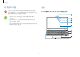 시작하기 ► 디스플레이 39.6cm (15.6 inch) 모델인 경우 번호/이름 마이크 1 설명 • 내장 마이크입니다. • 컴퓨터 사용 환경의 밝기를 인지하는 센서입니다. 2 • 주변 환경이 어두워지면 키보드의 백라이트가 켜집니다. 3 조도 센서 4 5 • 주변 환경이 밝아지면 키보드의 백라이트가 꺼집니다. 센서를 가리지 않도록 주의하세요. 6 카메라 • 사진이나 동영상을 촬영할 수 있습니다. 7 카메라 동작 표시등 • 카메라의 동작 상태를 표시합니다. 8 9 디스플레이/ 터치 스크린 • 컴퓨터의 작업 내용을 표시하는 화면입니다. • 터치 스크린 지원 모델에서는 화면에 입력되는 터치를 인식합니다. • 컴퓨터를 켜고 끄는 버튼입니다. 전원 버튼/ 지문 인식 센서 • 사용자의 지문을 인식하는 장치입니다. 지문을 이용하여 Windows, 앱 및 서비스에 로그인 할 수 있습니다. 숫자 키패드 • 키를 눌러 숫자를 입력하는 장치입니다.