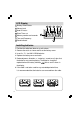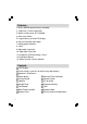 Caractéristiques 1. Antenne AM/FM intégrée pour meilleure réception. 2. 10 programmes (5 pour chaque bande de fréquence) 3. Résiste à l’eau jusqu’à un standard JIS7 4. Recherche automatique de stations 5. Ecran LCD large et facile à lire 6. Applique et support facile à fixer 7. Indicateur de niveau de batterie 8. Horloge 9. Minuteur sommeil ajustable 10. Court minuteur ajustable 11. Lumière LED d’urgence (Torche) F 12. Sonnerie d’urgence 13.