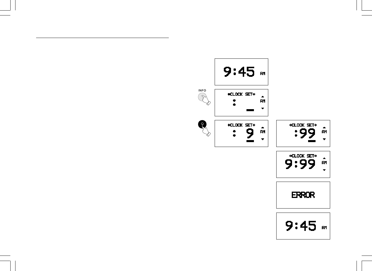 4. Press INFO button again to complete clock time set.