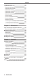 Contents [NETWORK] menu 156 [DIGITAL LINK MODE] 156 [DIGITAL LINK SETUP] 156 [DIGITAL LINK STATUS] 157 [NETWORK SETUP] 157 [NETWORK CONTROL] 158 [NETWORK STATUS] 158 [DIGITAL LINK MENU] 159 [Art-Net SETUP] 159 [Art-Net CHANNEL SETTING] 159 [Art-Net STATUS] 160 Network connection 160 Connecting to a twisted-pair-cable transmitter 161 Accessing from the web browser 162 Chapter 5 Maintenance Light source/temperature/filter indicators 182 When an indicator lights