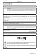 Read this first! WARNING: Do not look at or place your skin into the light emitted from the lens while the projector is being used. Doing so can cause burns or loss of sight. ff Strong light is emitted from the projector’s lens. Do not look at or place your hands directly into this light. ff Be especially careful not to let young children look into the lens. In addition, turn off the power and switch off the main power when you are away from the projector.
