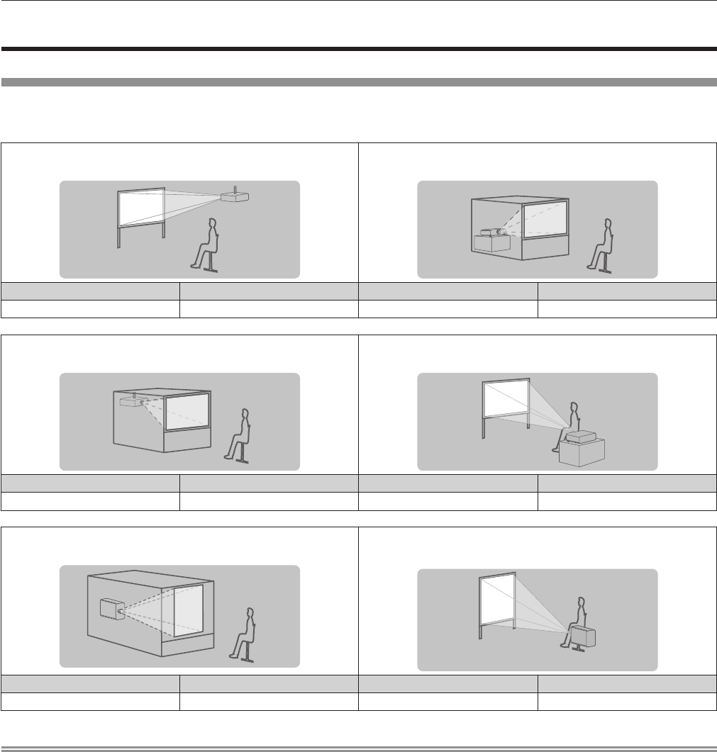 The installation modes of the projector are as follows. Set the [PROJECTOR SETUP] menu → [PROJECTION