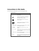 &RQYHQWLRQV LQ WKLV *XLGH The following table explains guide conventions and typography usage. *XLGH &RQYHQWLRQV Example Meaning and Use Note: Notes call attention to facts or advice that deserve special attention. Caution notices call attention to the possibility of damaging the product, the system, or your work (for example, potential loss of data). Warning notices call attention to the possibility of injury to people.
