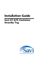 Savi ST-675 Container Security Tag Installation Guide Mounting the Tag 1. Open the right door of the container. 2. Using both hands, push the C-clamp on the tag onto the edge of the left door until it is on as far as it can go. Left door outside view Left door inside view 3. Flip the door sensor arm to the right position so it can contact the inside of the right door when it closes. 4. Close the right door. The door sensor arm is now armed and in position to trigger if the container is opened.