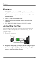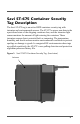 Features Features • ISO 18000-7 compliant active RFID tag with environmental sensor capability • Sensors monitor security status and environmental conditions inside shipping container • Unique C-clamp, door-mounted design • Supports low frequency technology for more precise locating capabilities • FCC, HERO, ETSI, RoHS (Directive 2002/95/EC) certified Activating the Tag The tag is shipped in sleep mode. You must remove and re-insert the battery to wake up the tag.