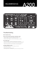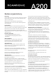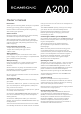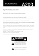 Käyttöopas Johdanto Kiitos, että valitsit A200:n. Toivomme, että tuotteemme ilahduttaa sinua pitkään. Lue tämä käyttöopas huolellisesti ennen pakkauksen purkamista ja tuotteen asentamista. Pakkauksen sisältö Olemme tarkistaneet vahvistimen huolellisesti tuotannon ja pakkauksen aikana. Tarkista kuitenkin tuote mahdollisten kuljetusvaurioiden varalta. Suosittelemme, että pidät alkuperäisen pahvilaatikon ja pakkausmateriaalit kuljetusta varten tulevaisuudessa.
