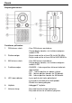 Português Localizações dos controlos e indicadores: Funções na parte frontal: 1. Indicador frequência FM - Mostra o alcance FM. - A retro iluminação laranja acender-se-á logo que o rádio seja ligado em FM. 2. Botão Sintonização Frequência - Rodar no sentido horário para sintonizar FM de 88-108 MHz. - Rodar no sentido horário para sintonizar AM de 540-1600 KHz. 3. Indicador Frequência AM - Mostra o alcance AM. - A retro iluminação laranja acender-se-á desde que o rádio tenha sido sintonizado em AM. 4.