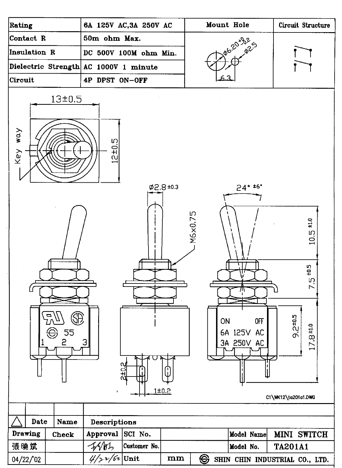 Toggle switch 250 Vac 3 A 2 x Off/On TA201A1 latch 1 pc(s)