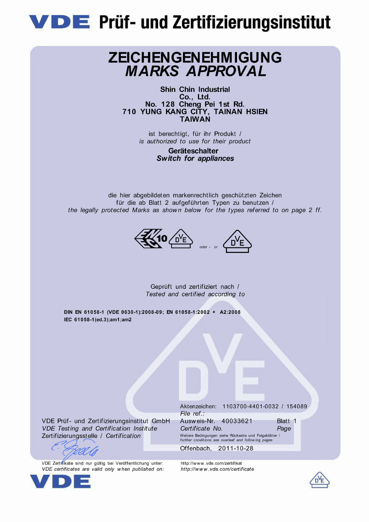 VDE Prüf- und Zertifizierungsinstitut Zeichengenehmigung Ausw eis-Nr. / Certificate No. Blatt / page 40033621 8 Name und Sitz des Genehmigungs-Inhabers / Name and registered seat of the Certificate holder Shin Chin Industrial Co., Ltd., No. 128 Cheng Pei 1st Rd., 710 YUNG KANG CITY, TAINAN HSIEN, TAIWAN Aktenzeichen / File ref. Datum / Date 1103700-4401-0032 / 154089 / FG31 / LF 2011-10-28 Dieses Blatt gilt nur in Verbindung mit Blatt 1 des Zeichengenehmigungsausw eises Nr.